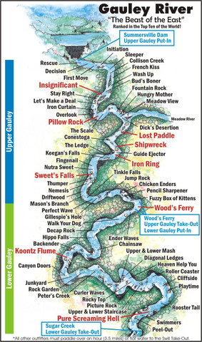 - Considered one of the Top 10 Whitewater Rivers in the World, the Gauley River is West Virginia’s legendary run.The Upper Gauley has unforgettable runs full of steep drops, massive holes and colossal waves. Roller coaster waves and challenging drops best characterize the Lower Gauley, though it’s not as steep as the Upper.